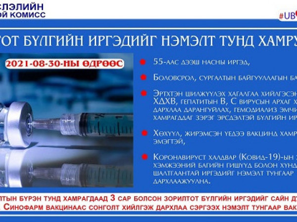 Коронавируст халдварын эсрэг дархлааны түвшинг нэмэгдүүлэх зорилгоор энэ сарын 30-наас эхлэн зорилтот бүлгийн иргэдийг нэмэлт тунгаар вакцинжуулахаар боллоо. Зорилтот бүлэгт 55-аас дээш насны, боловср…
