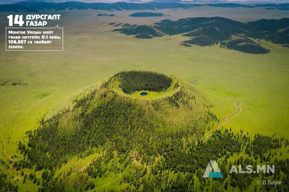 Монгол Улс нийт газар нутгийнхаа 21 хувийг улсын тусгай хамгаалалтад авсан. Үүнээс 0.1 хувь, 106,557 га талбай буюу 14 байршлыг ДУРСГАЛТ ГАЗАР-ын хамгаалалтад авсан байна. Тухайлбал, хангайн бүсэд орших Даяндээрхийн агуй нь нийт 31,277 га талбайг эзлэн оршдог аж.