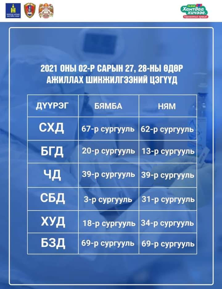 Амралтын өдрүүдэд дараах шинжилгээний цэгүүд ажиллаж, иргэдээс PCR шинжилгээ авна. Үүнд: