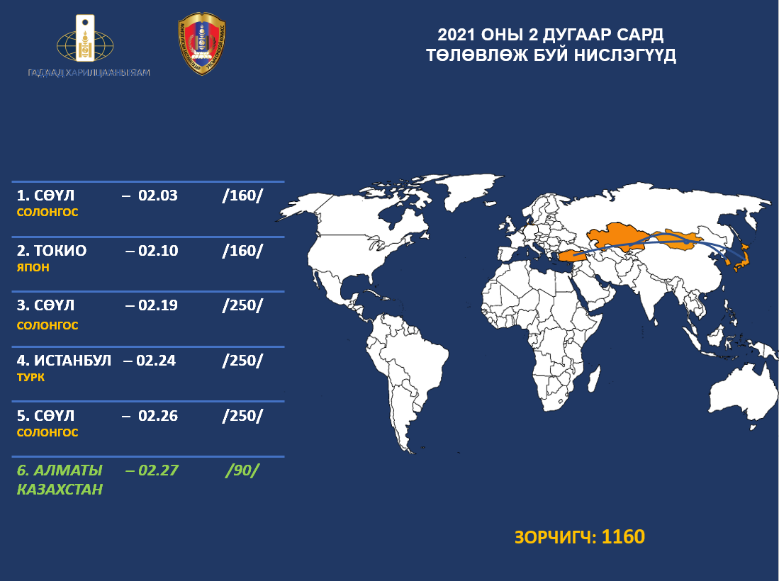 Казахстанд байгаа иргэдийн хүсэлтээр Алматы руу 2021 оны 02 сарын 27-ны өдөр "Хүннү Эйр" компани тусгай үүргийн нислэг үйлдэнэ.