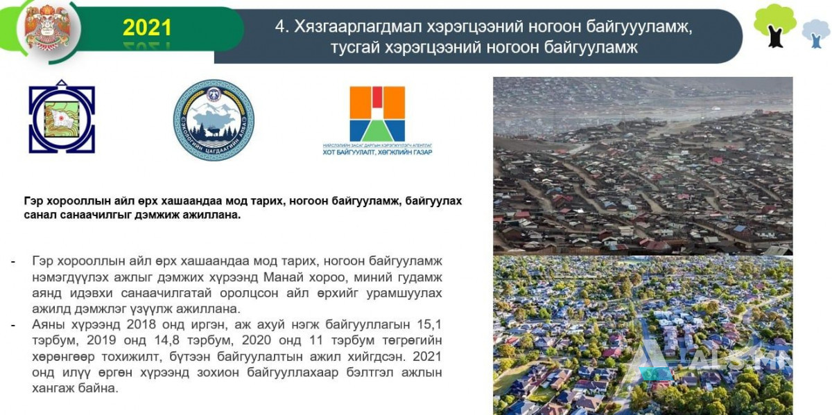 Өнгөрсөн дөрвөн жилийн ажлын үр дүнд нэг хүнд ногдох ногоон байгууламжийн хэмжээг 2-3 дахин нэмэгдүүлсэн бол 2021 онд Улаанбаатар хотын Захирагчийн ажлын албанаас улиасны унгарлийг бууруулах, арчилгааны ажлыг сайжруулах хүрээнд ажилбар бүрээр стандарт мөрдүүлэх, гэр хорооллын айл өрх хашаандаа мод тарих, ногоон байгууламж байгуулах саналыг дэмжиж ажиллах нь.
