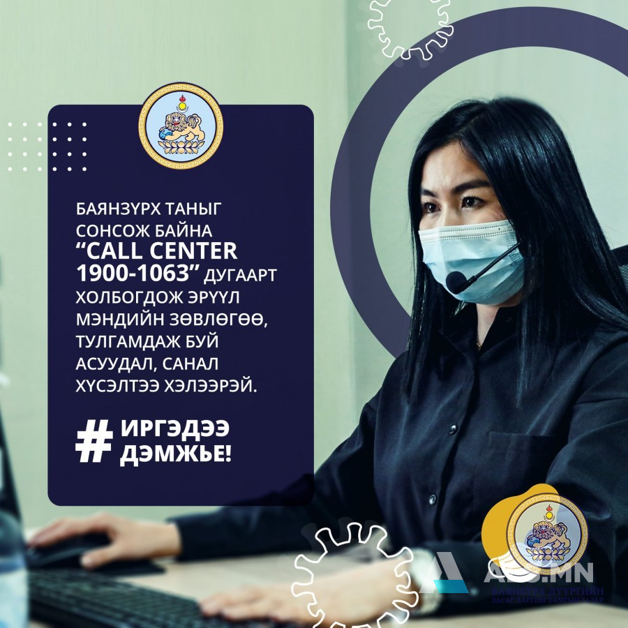 Баянзүрх дүүргийн иргэдэд эрүүл мэндийн зөвлөгөө, зөвлөмж, санал хүсэлт хүлээн авах зорилгоор 24 цагаар ажиллаж байгаа “Баянзүрх таныг сонсож байна CALL CENTER 1900-1063” дугаарт 2021 оны 04 дүгээр сарын 21-ээс 30-ны хооронд нийтдээ 296 дуудлага ирсэн байна.