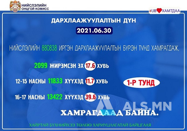 2021.06.30-нд нийслэлийн хэмжээнд I тунд 6804, II тунд 1222, нийт 8026 иргэнийг дархлаажууллаа. Энэ өдөр 183 жирэмсэн эх, 12-15 насны 4814, 16-17 насны 956 хүүхэд дархлаажуулалтад хамрагдав. Вакцинжуулалт эхэлснээс хойш нийслэлийн 18-аас дээш насны 1.008.666 иргэн I тунд, 880.838 иргэн II тунд хамрагдаад байна. Мөн нийт 2099 (17.6 хувь) жирэмсэн эх, 12-15 насны 11833 (11.7 хувь), 16-17 насны 13422 (39.6 хувь) хүүхэд дархлаажуулалтад хамрагдаж, вакцины I тун хийлгээд байна.