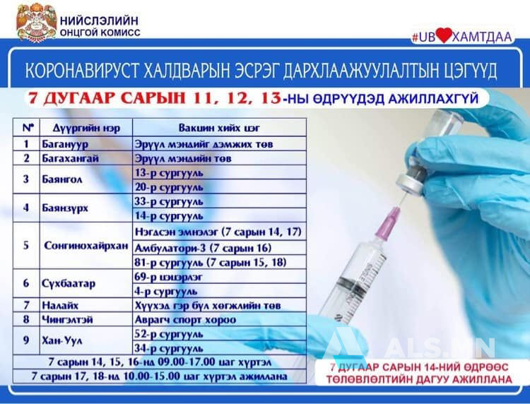 Долдугаар сарын 14-16-ны өдрүүдэд дархлаажуулалтын цэгүүд тогтсон цагийн хуваарийн дагуу буюу 09:00-17:00 цагт ажиллана. Харин 17, 18-нд 10:00-15:00 цагийн хооронд ажиллах хуваарь гарчээ.