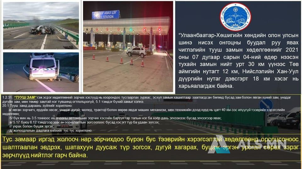 Иймд иргэд жолооч та бүхэн ТУУШ ЗАМ-ыг сонгон хөдөлгөөнд оролцож буй тохиолдолд тээврийн хэрэгслийн бүрэн бүтэн байдал, замаа зөв сонгон хөдөлгөөнд оролцохыг анхааруулж байна.