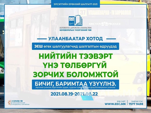 Шалгалт энэ сарын 22-ны өдөр үргэлжлэх бөгөөд Улаанбаатар хотод Элсэлтийн ерөнхий шалгалт өгөх шалгуулагчид өнөөдрөөс эхлэн Ням гараг дуустал шалгалт өгөх бичиг баримт буюу иргэний үнэмлэх, бүртгэлийн хуудас, суудлын хуваарь, бүрэн дунд боловсролын үнэмлэхээ үзүүлэн нийтийн тээврээр үнэ төлбөргүй зорчих боломжтой гэдгийг Боловсролын үнэлгээний төвөөс мэдээллээ.