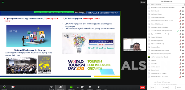 Аялал жуулчлалын салбарыг олон улсын жишигт нийцүүлэн хөгжүүлэх, салбарын мэргэжилтэн, боловсон хүчнийг чадавхжуулах, мэргэшүүлэх зорилгоор Аялал жуулчлалын хөгжлийн төв ТӨҮГ-с ээлжит цахим сургалтыг зохион байгууллаа. Сургалтад 21 аймгийн Байгаль орчин, аялал жуулчлалын газрын мэргэжилтнүүд хамрагдаж дараах сэдвийн хүрээнд хэлэлцлээ. 1. Аялал жуулчлалын хөгжлийн төвийн захирал С.Бат-Эрдэнэ: Дэлхийн аялал жуулчлалын өдрийг угтан зохион байгуулах ажлуудын талаар мэдээлэл, танилцуулга хийлээ.