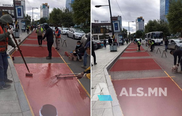 Нийслэлийн 2021-2022 оны өвөлжилтийн бэлтгэл хангах ажлын хүрээнд өвлийн улиралд мөстөж халтиргаа гулгаа ихээр үүсэхээс сэргийлж халтиргаанаас хамгаалах өнгөт хучилтыг нийтийн эзэмшлийн гудамж, замын уулзварын өгсөх хэсэгт болон автобусны буудлууд, нар тусдаггүй газарт хийж байна.