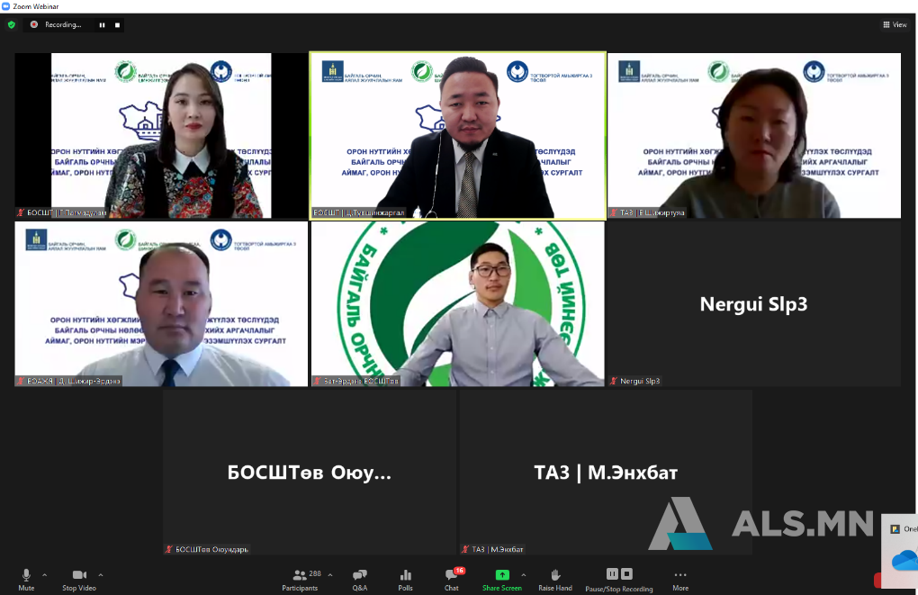 Байгаль орчин, аялал жуулчлалын яам, “Байгаль орчны, судалгаа шинжилгээний төв” УТҮГ, Тогтвортой амьжиргаа-3 төсөл хамтран Орон нутгийг хөгжүүлэх сангаас хэрэгжүүлэх төслийн үйл ажиллагаанд Байгаль орчны нөлөөллийн үнэлгээ хийх, түүнтэй холбогдох эрх зүйн зохицуулалт, орон нутагт анхаарах асуудал, шийдвэрлэх арга зам болон сум, дүүрэгт ажиллаж буй албан хаагчдад байгаль орчныг хамгаалах тухай хууль тогтоомжийг хэрэгжүүлэхэд дэмжлэг үзүүлэх, чадавх бэхжүүлэх сургалтыг 2021 оны 10 дугаар сарын 19-нөөс 10 дугаар сарын 22-ны өдрүүдэд цахимаар амжилттай зохион байгууллаа.