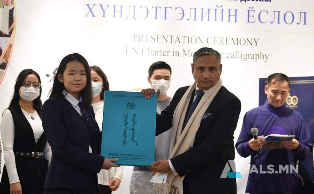 Монгол Улс НҮБ-ын бүрэн эрхт гишүүн болсоны 60 жилийн ойг тохиолдуулан 21 аймаг, Улаанбаатар хотыг төлөөлсөн монгол бичгийн шилдэг уран бичээч хүүхдүүд нэгэн хүсэл, зорилгын дор нэгдэн НҮБ-ын Дүрмийг анх удаа уран бичлэгээр урлан бүтээлээ.