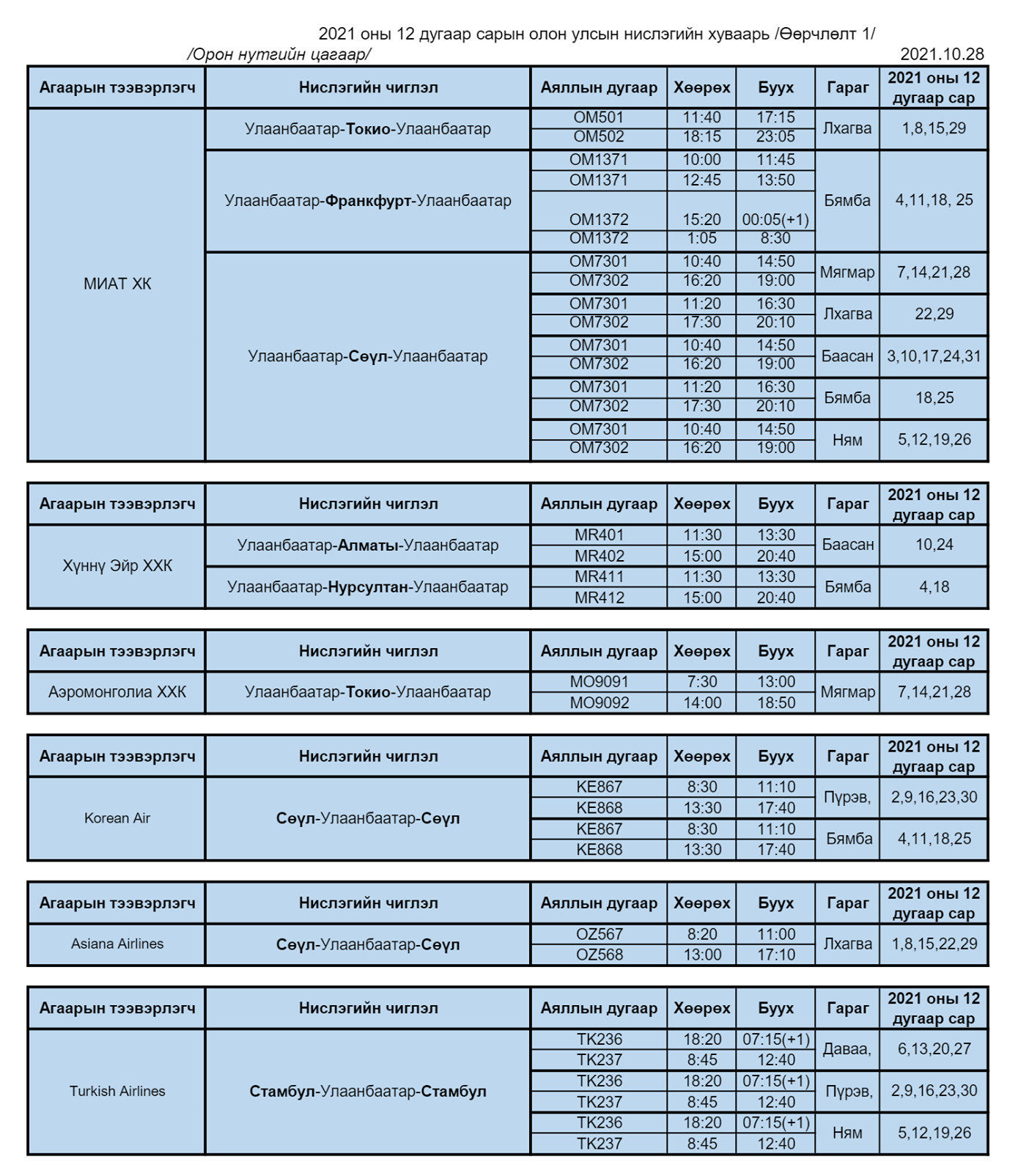Ирэх 12 дугаар сарын олон улсын тогтмол нислэгийн хуваарьт өөрчлөлт орж, зарим чиглэлийн нислэгийн тоо нэмэгдлээ гэж Иргэний нисэхийн ерөнхий газраас мэдээллээ.