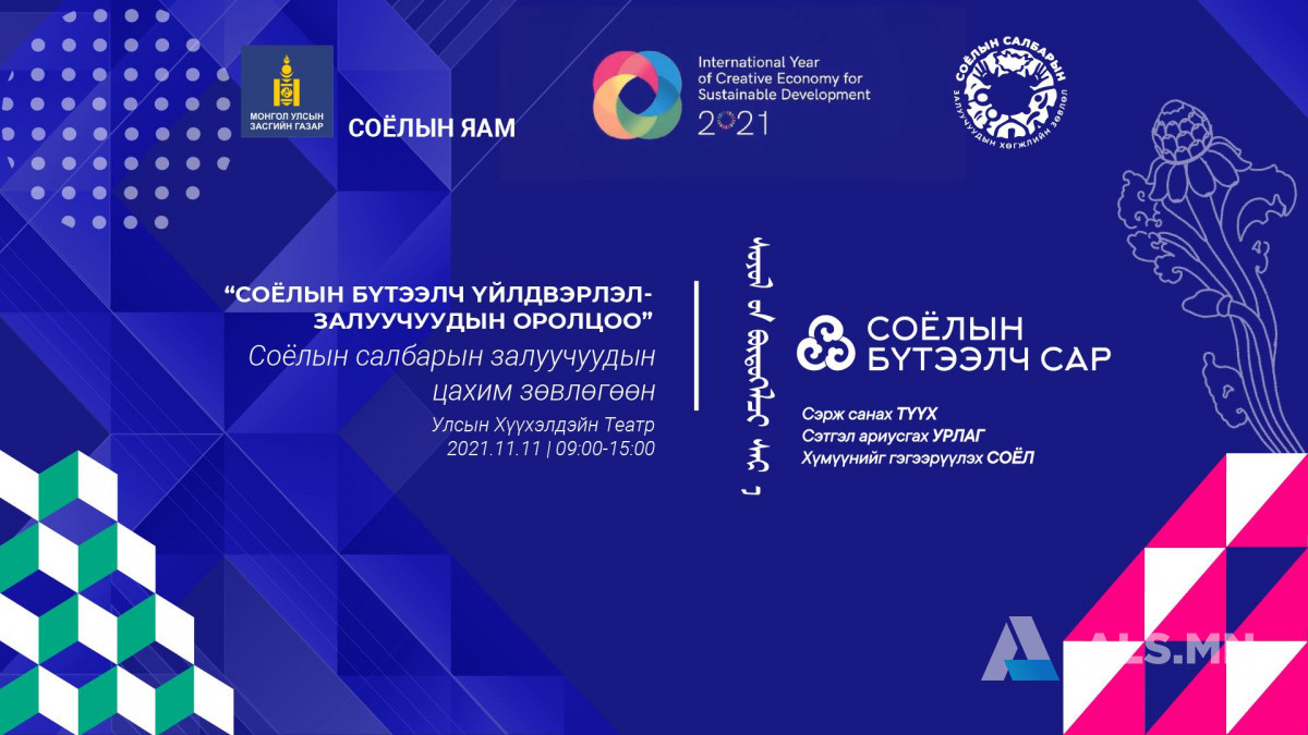 Соёлын яамнаас 11 дүгээр сарын турш хэрэгжүүлж буй “Соёлын бүтээлч сар” аяны хүрээнд “Соёлын бүтээлч үйлдвэрлэл-Залуучуудын оролцоо” сэдэвт соёлын салбарын залуучуудын цахим зөвлөгөөнийг 2021 оны 11 дүгээр сарын 11-ний өдөр 10:00-15:00 цагт зохион байгуулах гэж байна.