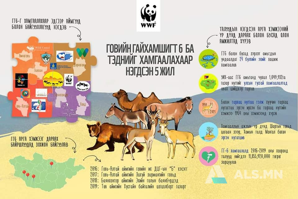 Дэлхийн байгаль хамгаалах сан (WWF)-гийн Монгол дахь хөтөлбөрийн газрын санаачилгаар Монгол орны говийн зэрлэг амьтад болох хавтгай, мазаалай, тахь, хулан, монгол бөхөн, хар сүүлт, тэдгээрийн амьдардаг экосистемийг хамгаалах, уг ажилд төрийн болон төрийн бус байгууллага, нутгийн иргэдийг татан оролцуулах зорилгоор “Говийн гайхамшигт 6” арга хэмжээг санаачилсан нь эдүгээ иргэдийн хүсэн хүлээдэг байгаль хамгааллын томоохон арга хэмжээ болж өргөжөөд байгаа билээ.