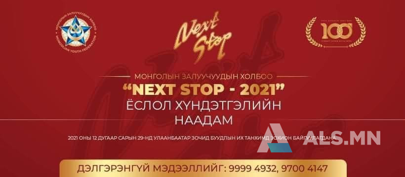 Монголын Залуучуудын Холбооны 100 жилийн түүхэн ойн хүрээнд нийгэм, улс төр, эдийн засаг, бизнесийн салбарын Шилдэг залууг тодруулан алдаршуулах “NEXT STOP - 2021” ёслол хүндэтгэлийн наадам 29 дэхь жилдээ зохион байгуулагдаж байна.