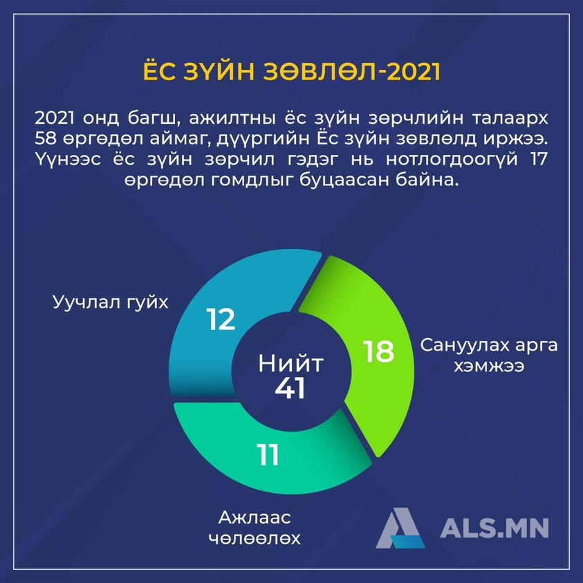 Ёс зүйн зөрчил гаргасан 41 албан хаагчид сахилгын хариуцлага оногдуулсан байна. Үүнээс 12 албан хаагчид уучлал гуйхыг үүрэг болгож, 18 албан хаагчид сануулах арга хэмжээ авч, 11 албан хаагчийг ажлаас чөлөөлжээ.