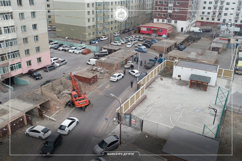 Баянзүрх дүүргийн 15,18-р хороонд байрлах 73 гараашийг буулгаж газрыг чөлөөллөө. Тухайн байршил нь сургууль, цэцэрлэг орчмын бүс бөгөөд замын хөдөлгөөний ачаалал их байдаг. Мөн зарим хэсэгт хогийн цэг хүртэл үүссэн байсан юм.