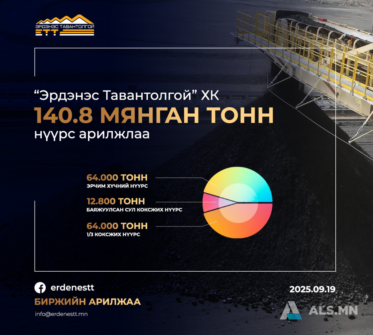 "Эрдэнэс Тавантолгой" ХК 2025 оны 9 дүгээр сарын 19-ний өдөр Монголын Хөрөнгийн Биржээр дамжуулан 3 удаагийн арилжааг амжилттай хийж 2.66 сая ам.долларын үнийн дүн бүхий 64,000 мянган тонн эрчим хүчний нүүрс, 1.16 сая ам.долларын үнэлгээ бүхий 12,800 мянган тонн Баяжуулсан сул коксжих нүүрс, 4.4 сая ам.долларын үнэлгээ бүхий 64,000 мянган тонн 1/3 коксжих нүүрс борлууллаа.