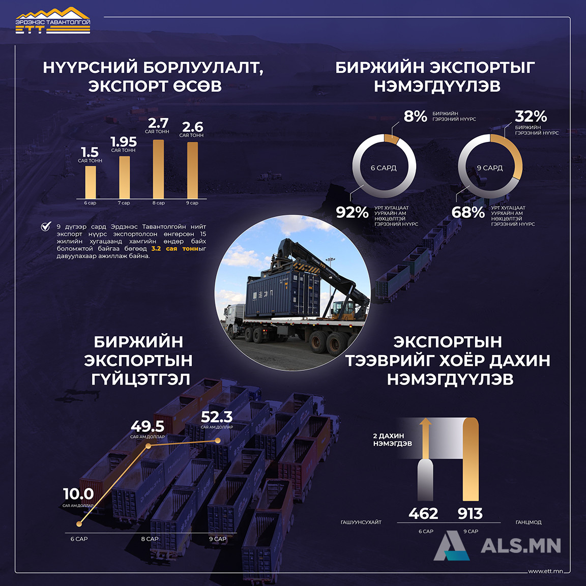 “Эрдэнэс Тавантолгой” ХК-ийн нүүрсний экспорт, гарцыг нэмэгдүүлэх, салбар хоорондын уялдааг сайжруулах арга хэмжээг богино хугацаанд авч хэрэгжүүлсний үр дүнд сүүлийн 3 сард экспортын хэмжээ, тээвэр, биржийн борлуулалт өсөж байна.