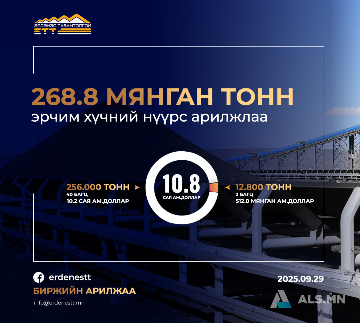"Эрдэнэс Тавантолгой" ХК 2025 оны 9 дүгээр сарын 29-ний өдөр Монголын Хөрөнгийн Биржээр дамжуулан 2 удаагийн арилжааг амжилттай хийж 10.8 сая ам.долларын үнийн дүн бүхий 268.8 мянган тонн эрчим хүчний нүүрс амжилттай арилжааллаа. Арилжаанд нийт 2 харилцагч оролцож БНХАУ-ын Мандал боомт хүргэж өгөх нөхцөлтэй 268.8 мянган тонн эрчим хүчний нүүрс худалдан авлаа.