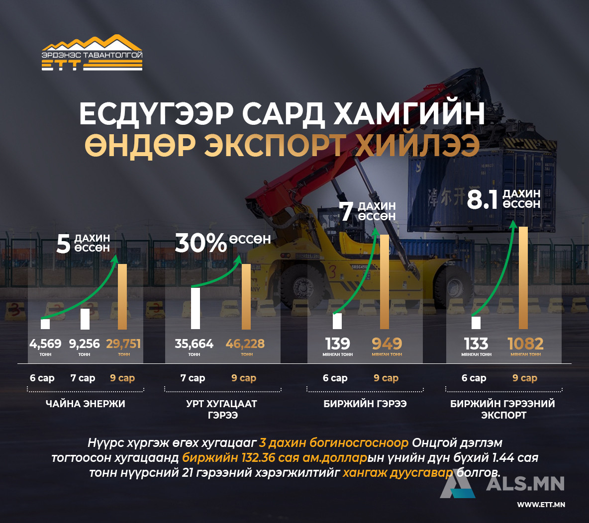 “Эрдэнэс Тавантолгой” ХК 2025 оны наймдугаар сард 2.7 сая тонн нүүрс экспортолсон бол 2025 оны есдүгээр сард 3.2 сая тонн нүүрс Гашуунсухайт, Ханги боомтоор экспортолсон байна. Есдүгээр сарын нүүрсний экспорт “Эрдэнэс Тавантолгой” ХК-ийн бүх цаг үеийн хамгийн өндөр экспортын үзүүлэлт болж байна.