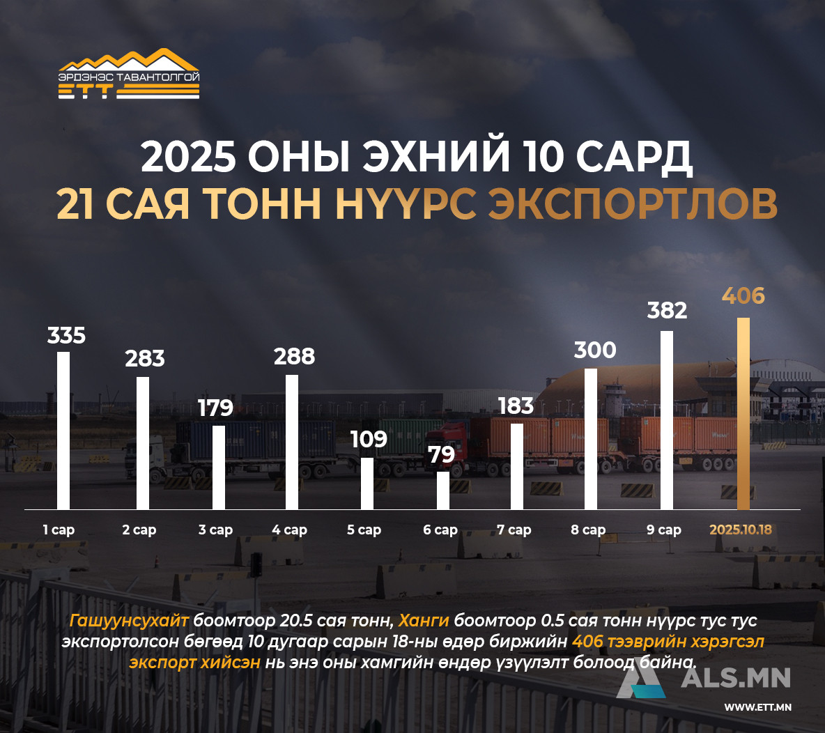 “Эрдэнэс Тавантолгой” ХК-ийн борлуулалт, ачилт, тээвэр логистикийн зохион байгуулалтыг сайжруулж, нүүрсний экспорт, гарцыг нэмэгдүүлэх арга хэмжээ авч хэрэгжүүлсний үр дүнд 2025 оны 10 дугаар сарын 22-ны өдрийн байдлаар нийт 21 сая тонн нүүрс экспортлоод байна. Үүнээс Гашуунсухайт боомтоор 20.5 сая тонн, Ханги боомтоор 0.5 сая тонн нүүрс тус тус экспортолсон бөгөөд 10 дугаар сарын 18-ны өдөр биржийн 406 тээврийн хэрэгсэл экспорт хийсэн нь энэ оны хамгийн өндөр үзүүлэлт болоод байна.