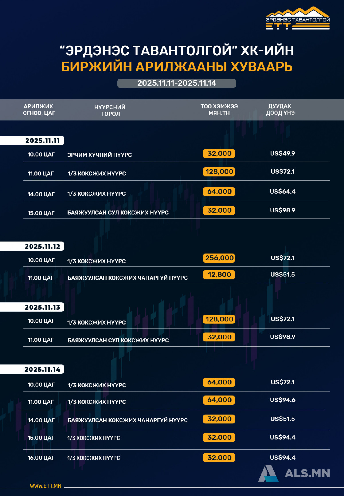 ЭРДЭНЭС ТАВАНТОЛГОЙ ХК-ИЙН 2025 ОНЫ 11 ДҮГААР САРЫН 11-14-НИЙ ӨДРҮҮДИЙН БИРЖИЙН АРИЛЖААНЫ ХУВААРЬ